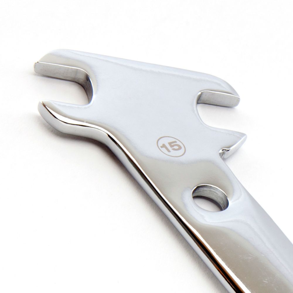 • Angled 15mm axle nut wrench provides clearance away from wheels