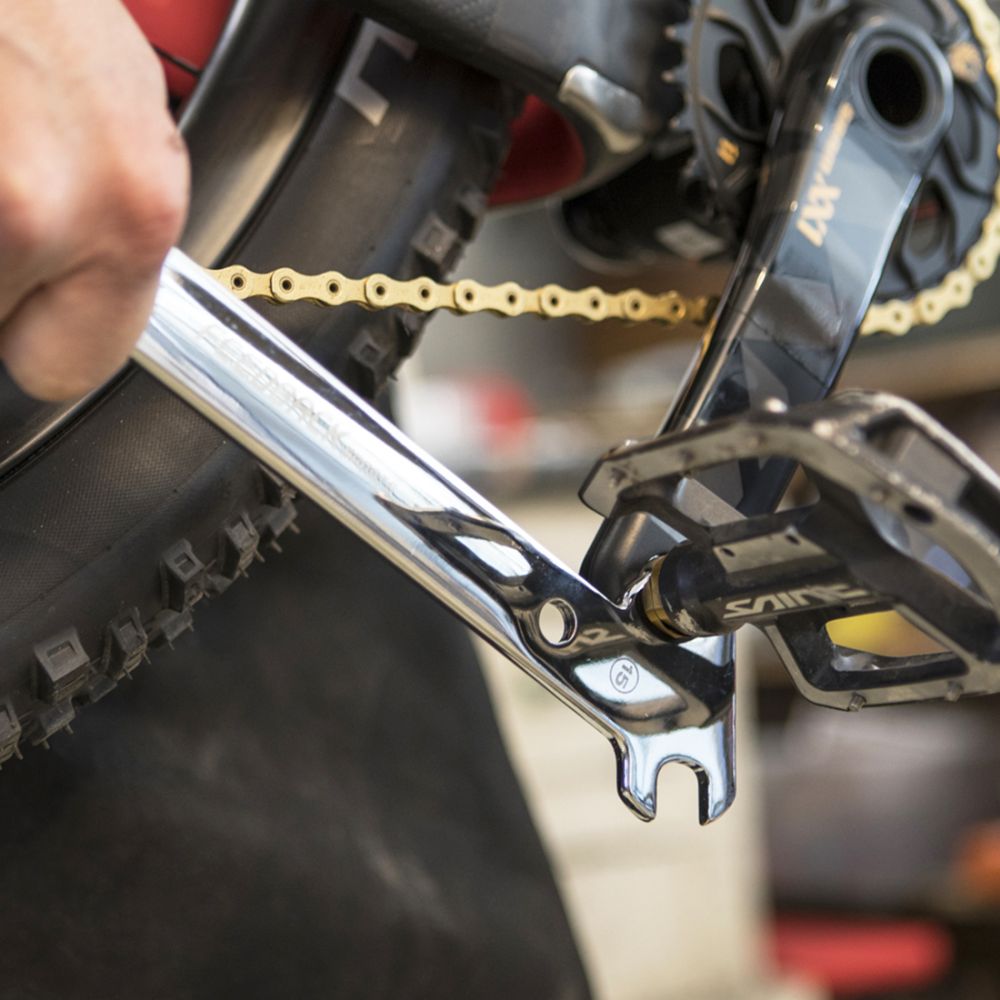 A good pedal wrench should be a pretty straightforward tool, and making it beautiful shouldn’t be overlooked – that’s definitely the case with our 15mm pedal and axle nut wrench combination tool. Two unique angled slots provide optimal mechanical advantage for removing even the most challenging pedals. At the opposite end is a precision closed 15mm axle nut tool that’s angled to provide ample clearance away from wheels. Made from forged, hardened and polished CRV tool steel, this is a one-time purchase, guaranteed. Available separate, or find it in our Team Edition and Ride Prep Tool Kits.