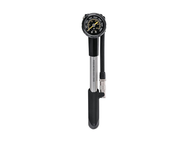 A precision fork and shock pump with an easy-to-read dial gauge for accurate pressure readings up to 360 psi / 24.8 bar. An air release button and Pressure-Rite connector makes setting proper pressure easy and eliminates air loss when disconnecting, while the flexible hose takes stress off the valve stem when pumping.